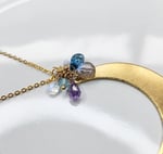 All the dreamy gemmy gems and a golden star and moon🌙, faceted London blue topaz, zircon, labradorite, sky blue topaz, moonstone and blue lace agate are all clustered together with a brass crescent moon and mini star charm for a dreamy and beautifully balanced design of edgy and whimsical.
